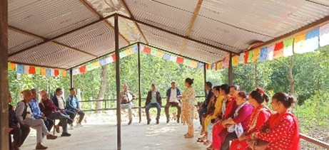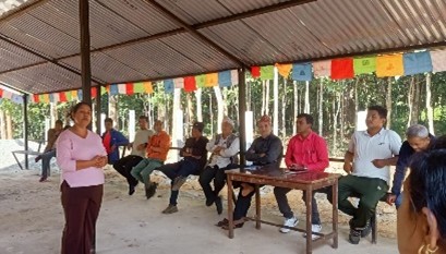 Upon arrival at Dipad CF, Mr. Rupak Bojam, in-charge of the Rapti Division Office, welcomed the participants and shared an insightful overview of the forest, reflecting his thorough understanding of its history, challenges, and progress. Established in 2063 B.S. and covering 170.89 hectares, Dipad CF introduced Scientific Forest Management (SFM) practices in its operational plan developed in 2072 B.S., including systematic thinning, regeneration cuts, and selective harvesting.Mr. Bojam recounted a significant incident in 2078 B.S., when a windstorm caused substantial damage, toppling nearly 900 trees. A subsequent ministerial investigation confirmed the windstorm as the cause, and the community salvaged the fallen trees.Dipad CF has also implemented several proactive measures, such as constructing a 6 km fire line to prevent forest fires, achieving a three-to-four-year streak without incidents. Regular monitoring by three guards and additional seasonal workers during fire line construction has enhanced forest protection while providing local employment opportunities. Strict regulations, including penalties for violations, have been enforced to maintain forest integrity.Sustainable practices, such as thinning, pruning, and enrichment planting, have been pivotal in ensuring forest health and productivity. Furthermore, the establishment of three compost pits for converting organic waste into compost manure has supported soil health and contributed economically through sales, with the revenue reinvested into community and forest development activities. Dipad CF’s new five-year operational plan, currently under review for 2079 B.S., reflects its commitment to sustainable management.